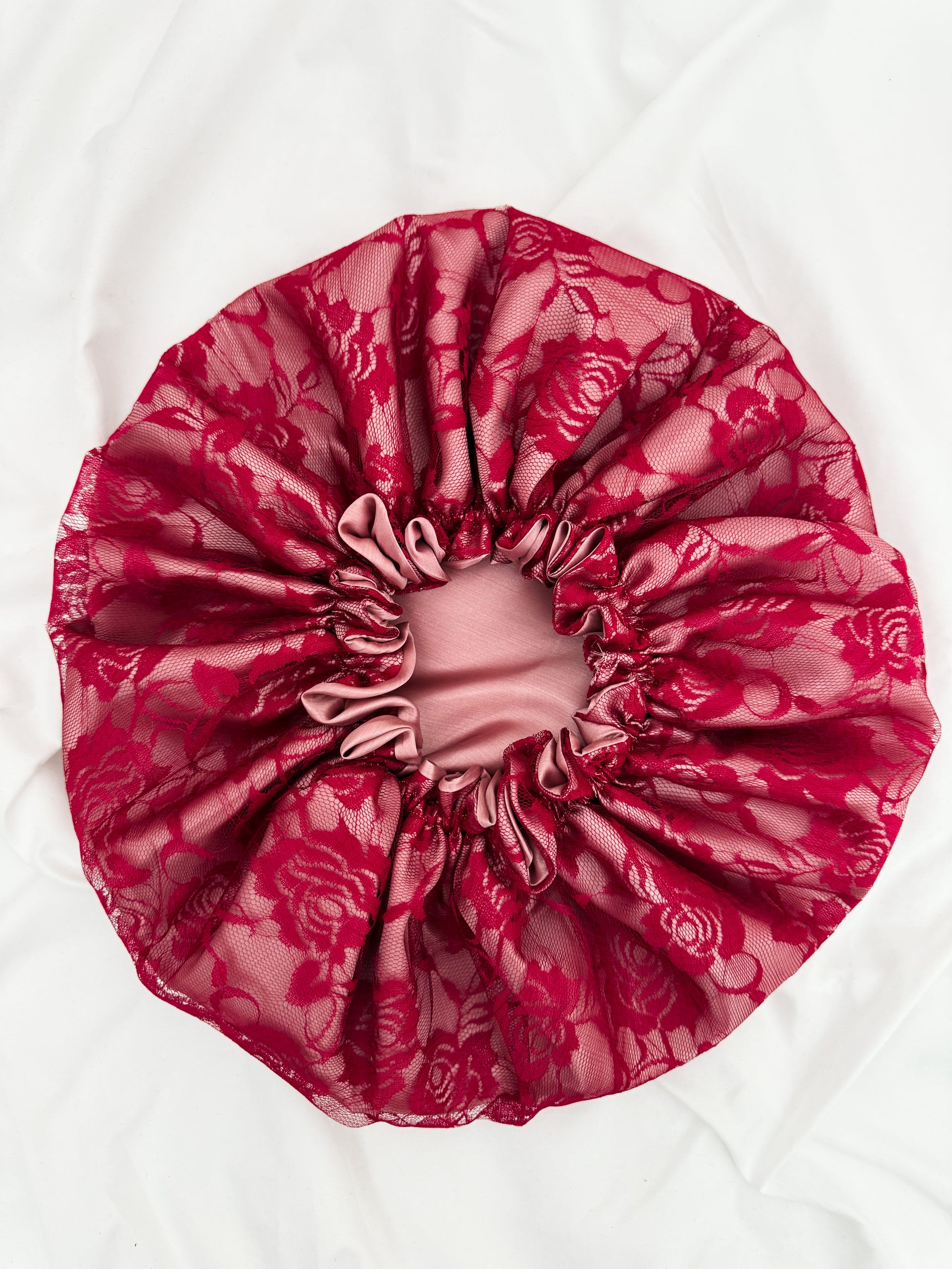 Lace Double Lined Satin Hair Bonnet - Pink Red